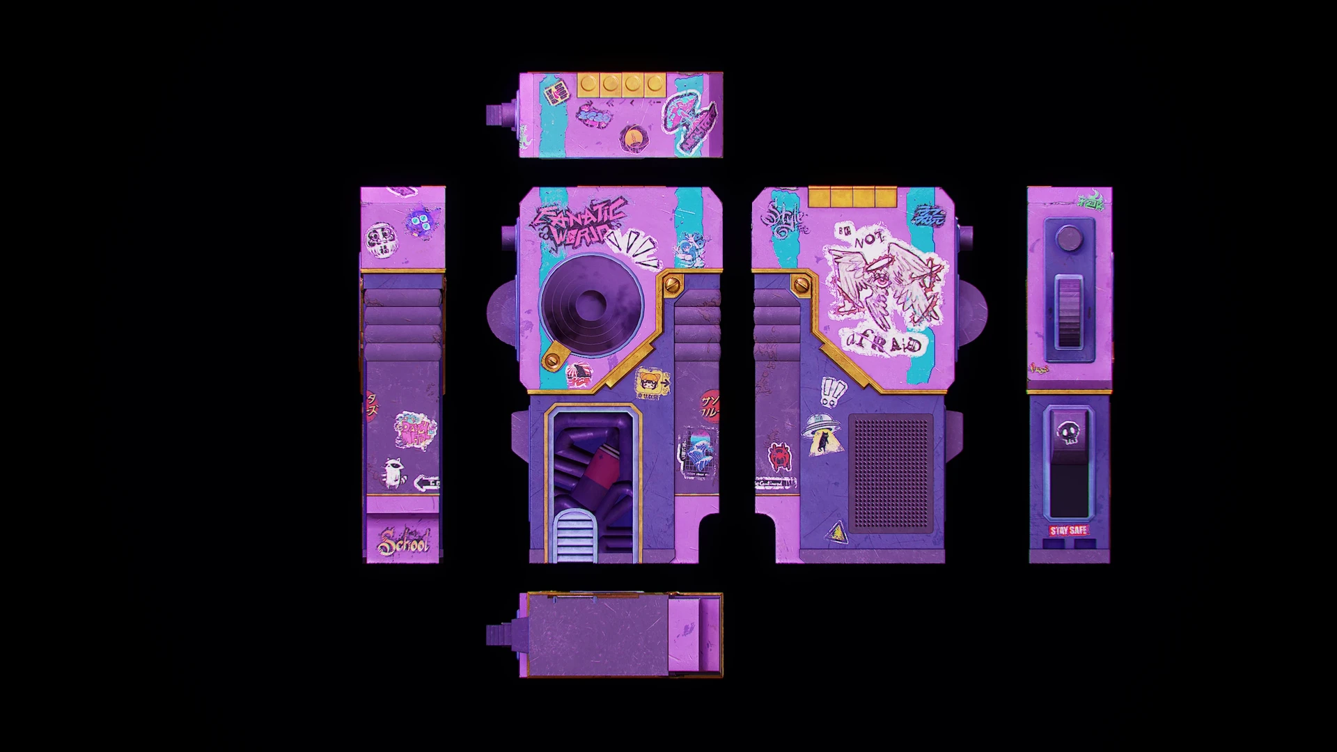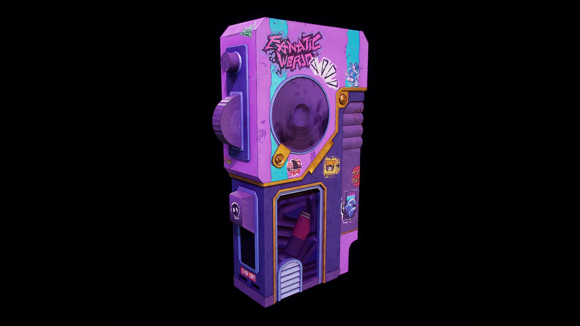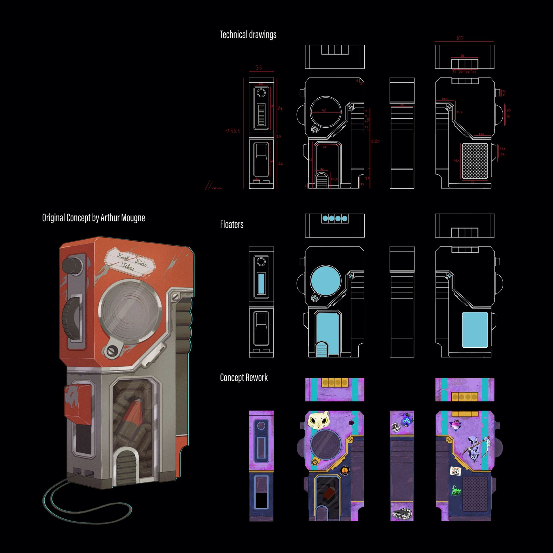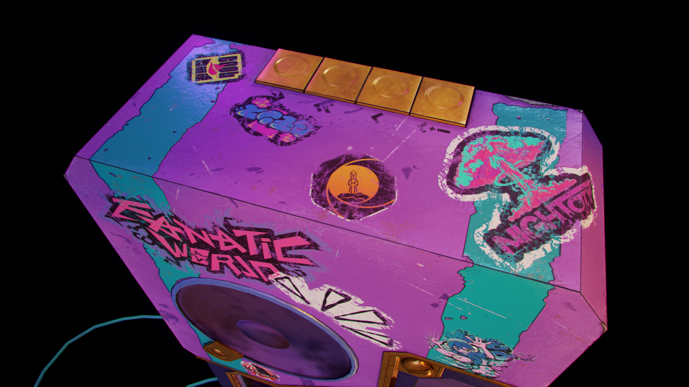 L’objectif était d’explorer les techniques de stylisation, l’équilibrage des couleurs et la lisibilité des matériaux afin d’obtenir une esthétique de gadget rétro.